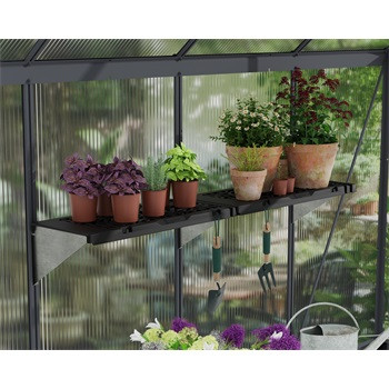 A polcok rögzítése nagyon egyszerűen történik, a Palram üvegház belső keretén belül elhelyezett mélyedések segítségével. Kiválaszthatja, hogy az üvegház melyik részére kívánja elhelyezni a polcot, és egyben azt is eldöntheti, hogy egy hosszú, egybefüggő polcot szeretne-e, vagy két különböző helyen rögzíti a két polcot.