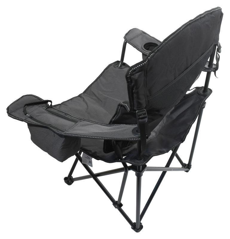Összecsukható kempingszék, párnázott karfával, italtartóval és hordozótáskával, teherbírása 135 kg-ig, varrott huzattal, acélszerkezet.