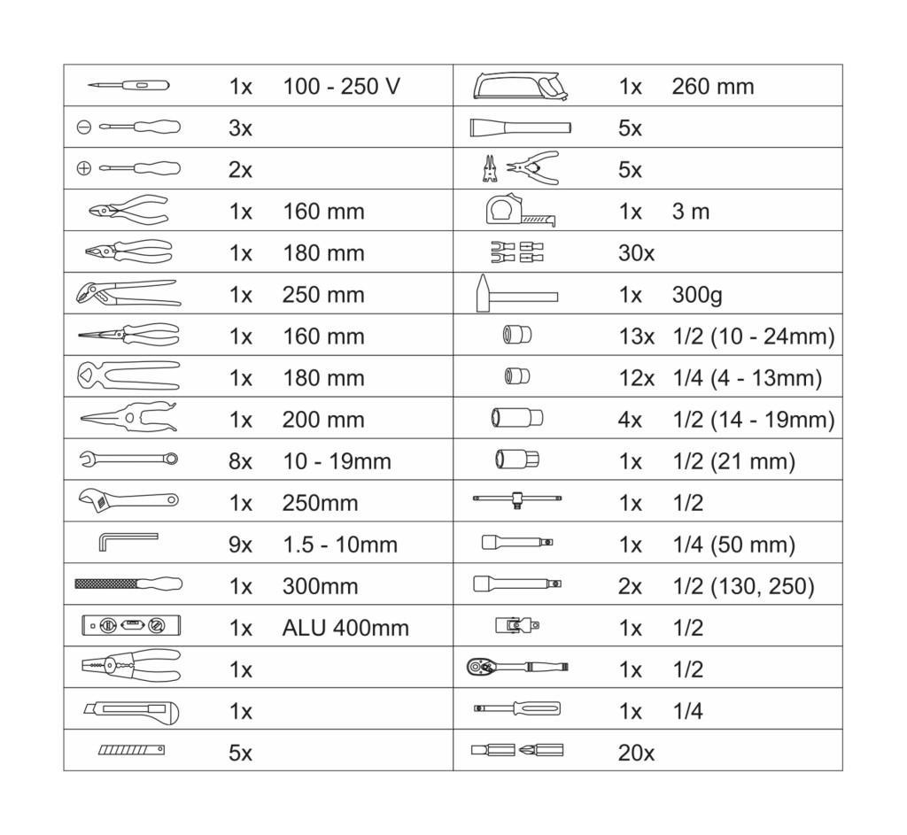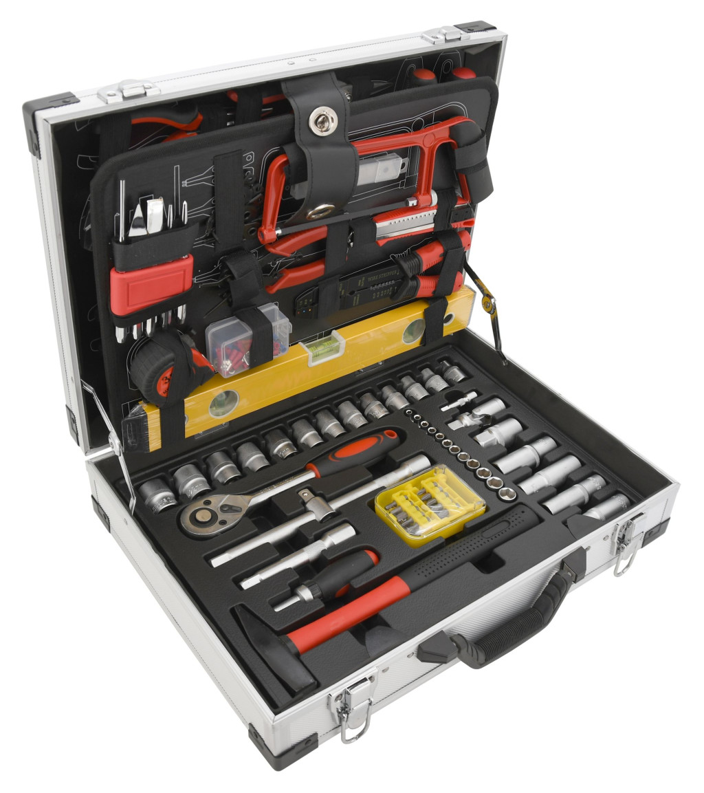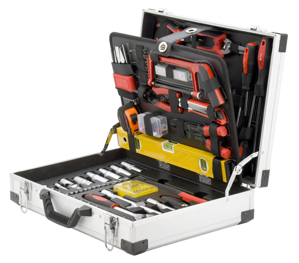 Az ALU-PROFI szerszámkészlet a Compass márkától 139 darab szerszámot tartalmaz. Az ellenálló fémből készült kofferben megtalál minden szükséges szerszámot laposkulcsokat, vízmértéket, fűrészt, szikét, fogót, villany mérőeszközt és egyebet beleértve. A hordozható koffer exkluzív CR-V szerszámmal van ellátva, amely az előre meghatározott helyekben van tárolva 4 rendszerezőben. A koffer alján egy 45 fogas mechanizmussal rendelkező racsnira való betét van elhelyezve. Itt megtaláljak a helyüket a racsinfejek és a tartozékok is, egy kalapács és egy racsnis csavarhúzó bitfejekkel.