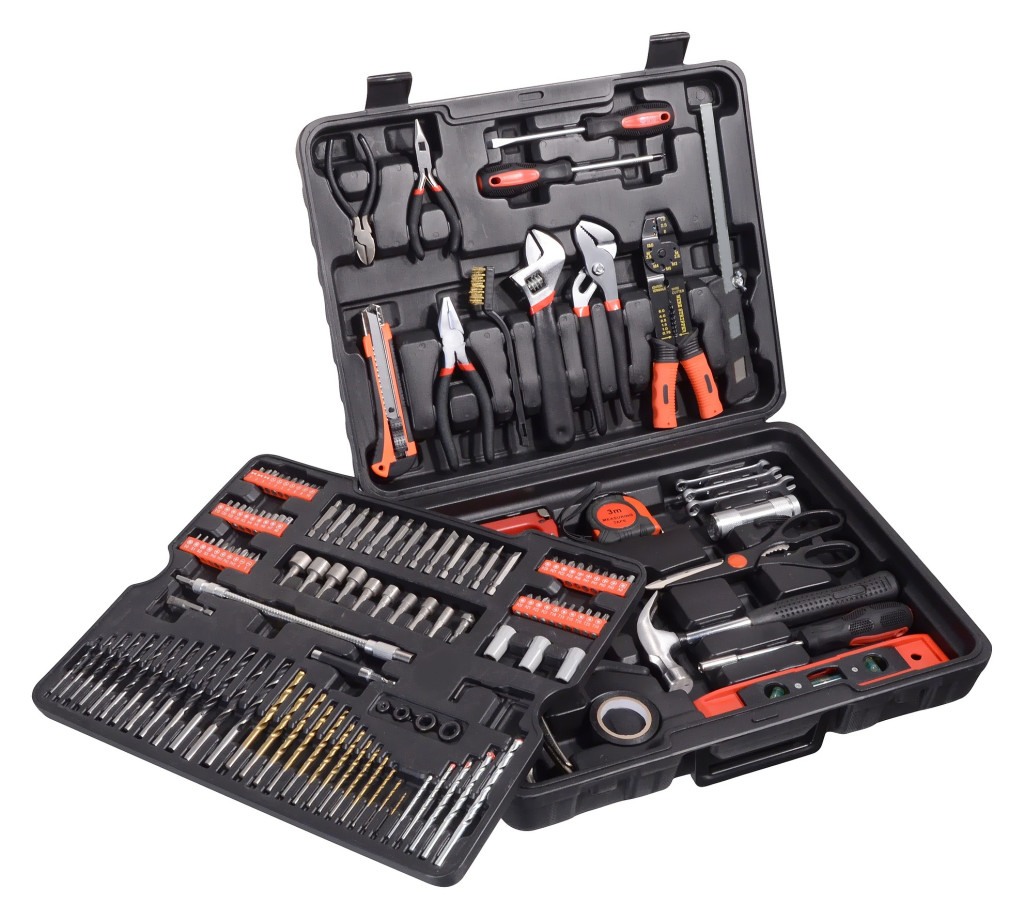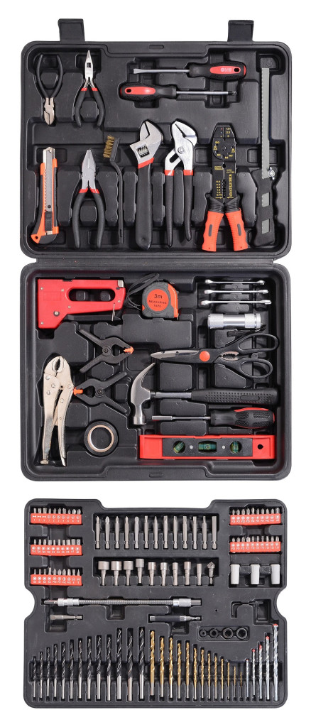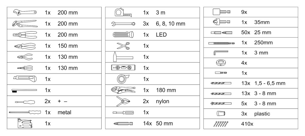 A készlet számos fúróhegyet, dugókulcsot, csavarhúzót, fogót, kalapácsot, vízmértéket, csavarkulcsot, alapvető kötőelemet és sok más szerszámot tartalmaz, amelyek használhatók otthon, a garázsban és az utakon is.
