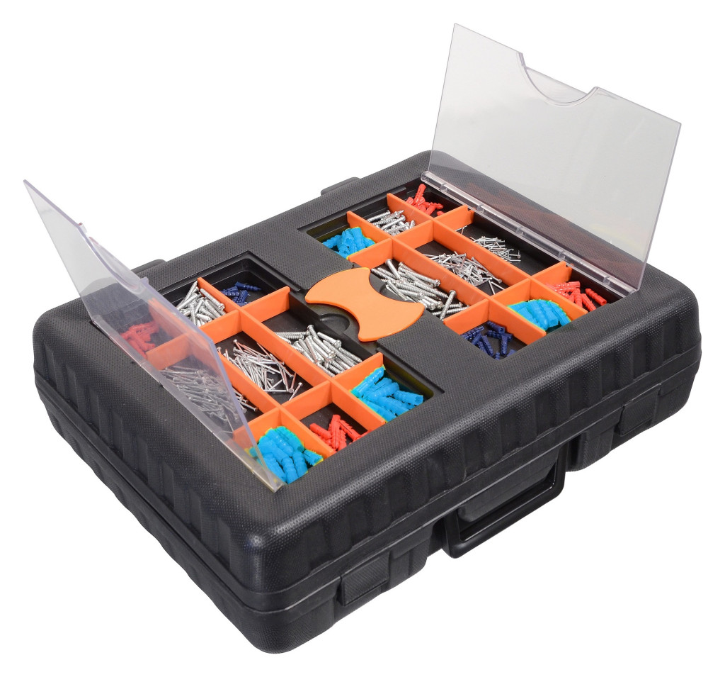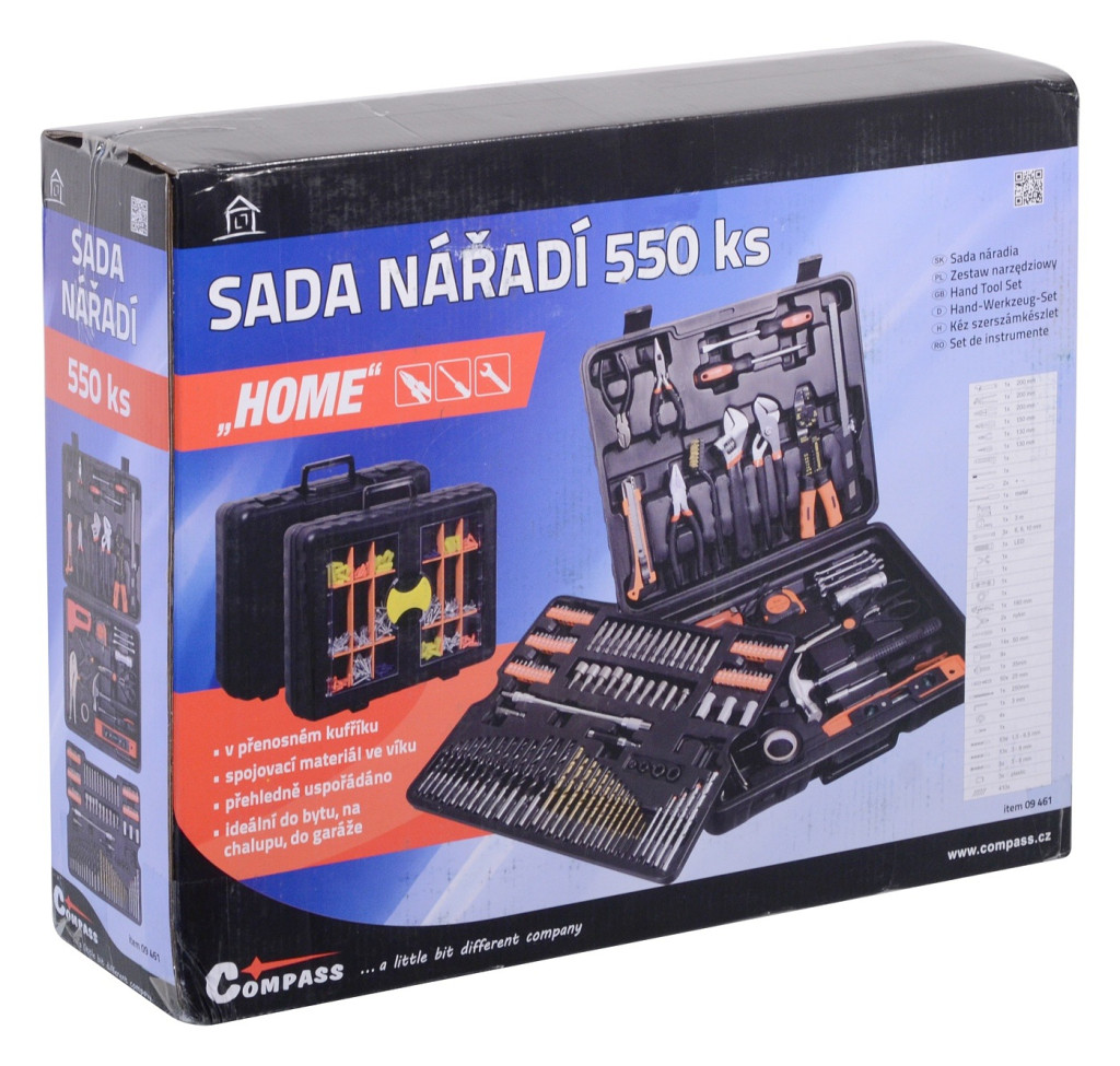 A Compass HOME koffer 550 darab minőségi szerszámot és alapvető kötőelemet tartalmaz. A készlet számos fúróhegyet, bitet, dugókulcsot, csavarhúzót, fogót, kalapácsot, vízmértéket, csavarkulcsot, alapvető kötőelemet és egyéb szerszámokat tartalmaz.