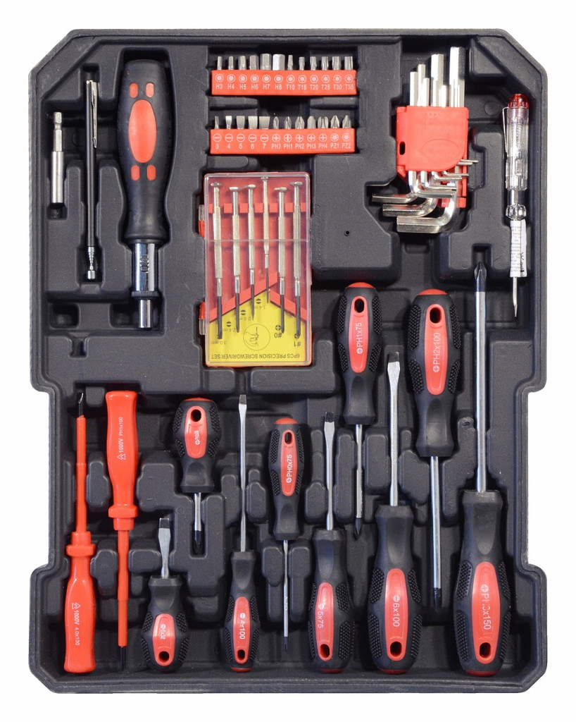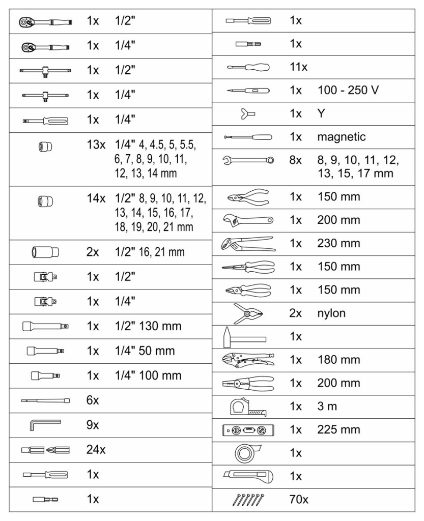 A készlet különféle fogókat, csavarhúzókat, villáskulcsokat, kalapácsot és egyebeket tartalmaz. A minőséges szerszámokat és alapvető csatlakozó anyagokat tartalmazó szerszámos láda elengedhetetlen segítője minden otthonnak és otthoni barkács műhelynek.