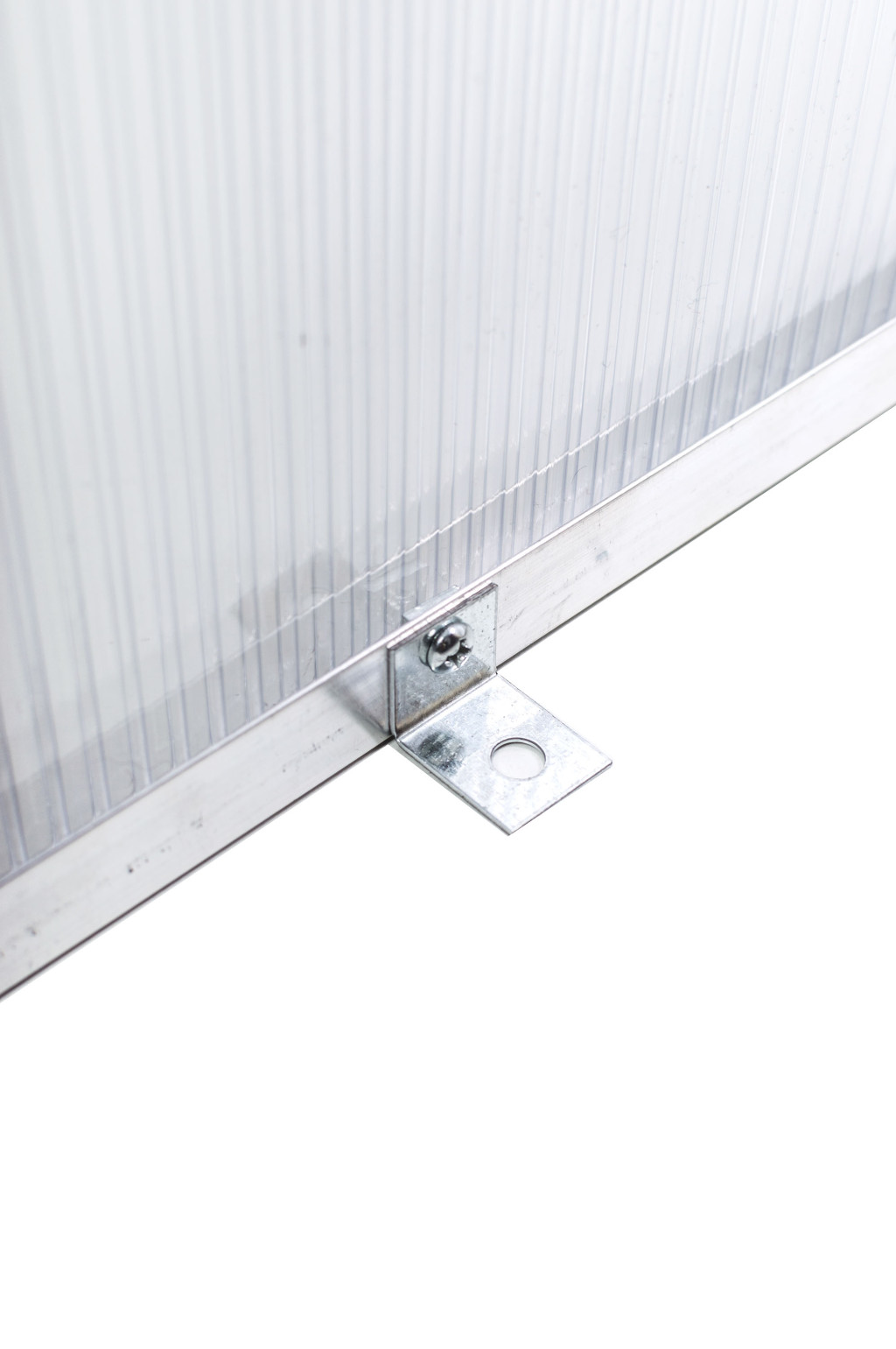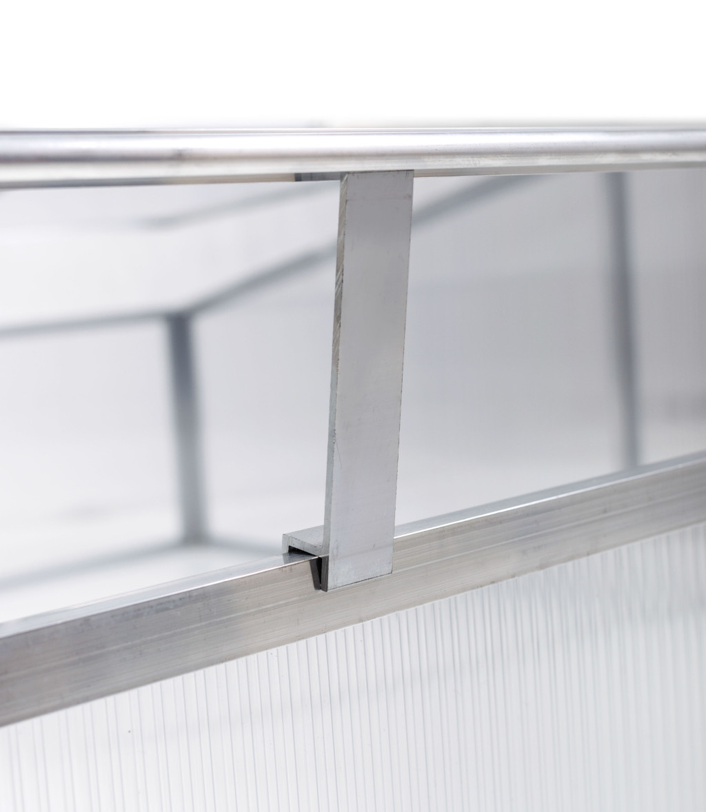 Minden polikarbonát lemez egyik oldala fehér fóliával van borítva.Ez az oldal UV-védett, ezek a külső falak, amelyek a nap felé néznek.Összeszereléskor minden lemez szélétől kb. 2 hüvelynyi védőfóliáthúzzon le. Az összeszerelés után távolítsa el a maradék fóliát is.