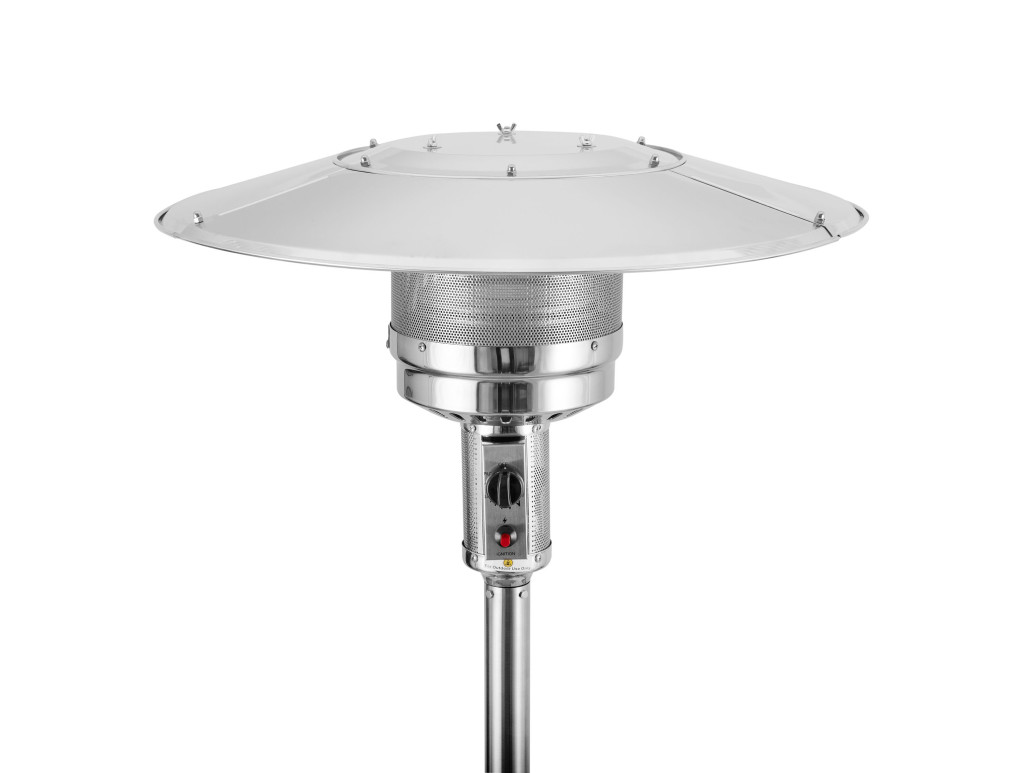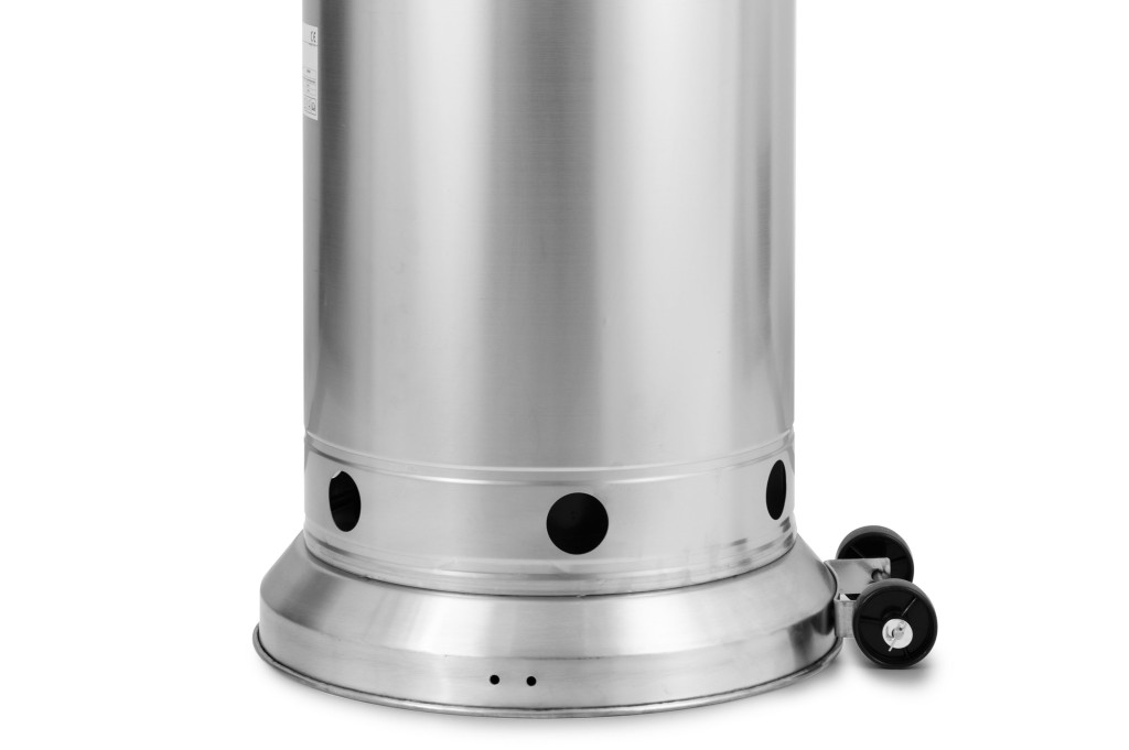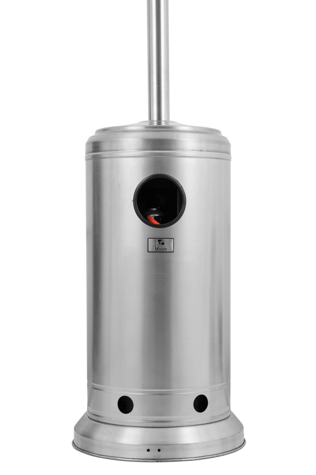 G21 Moon kültéri hősugárzó rozsdamentes acél kialakításban, gázpalack egyszerű csatlakozásával. Magas teljesítmény - 13 kW. Piezo elektromos gyújtás, kerekek az egyszerű áthelyezéshez.