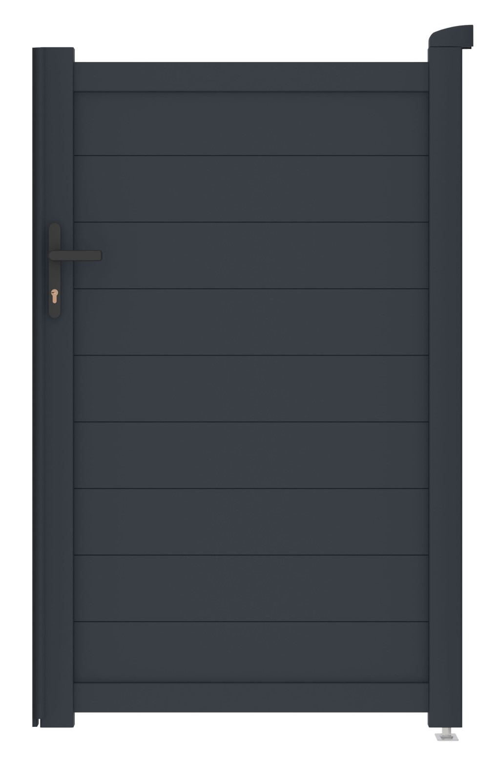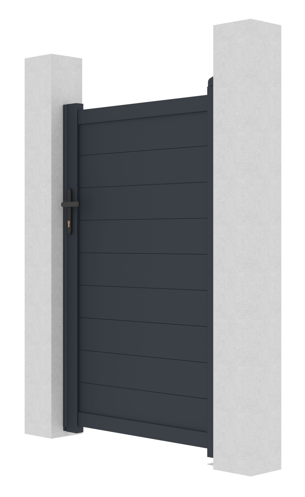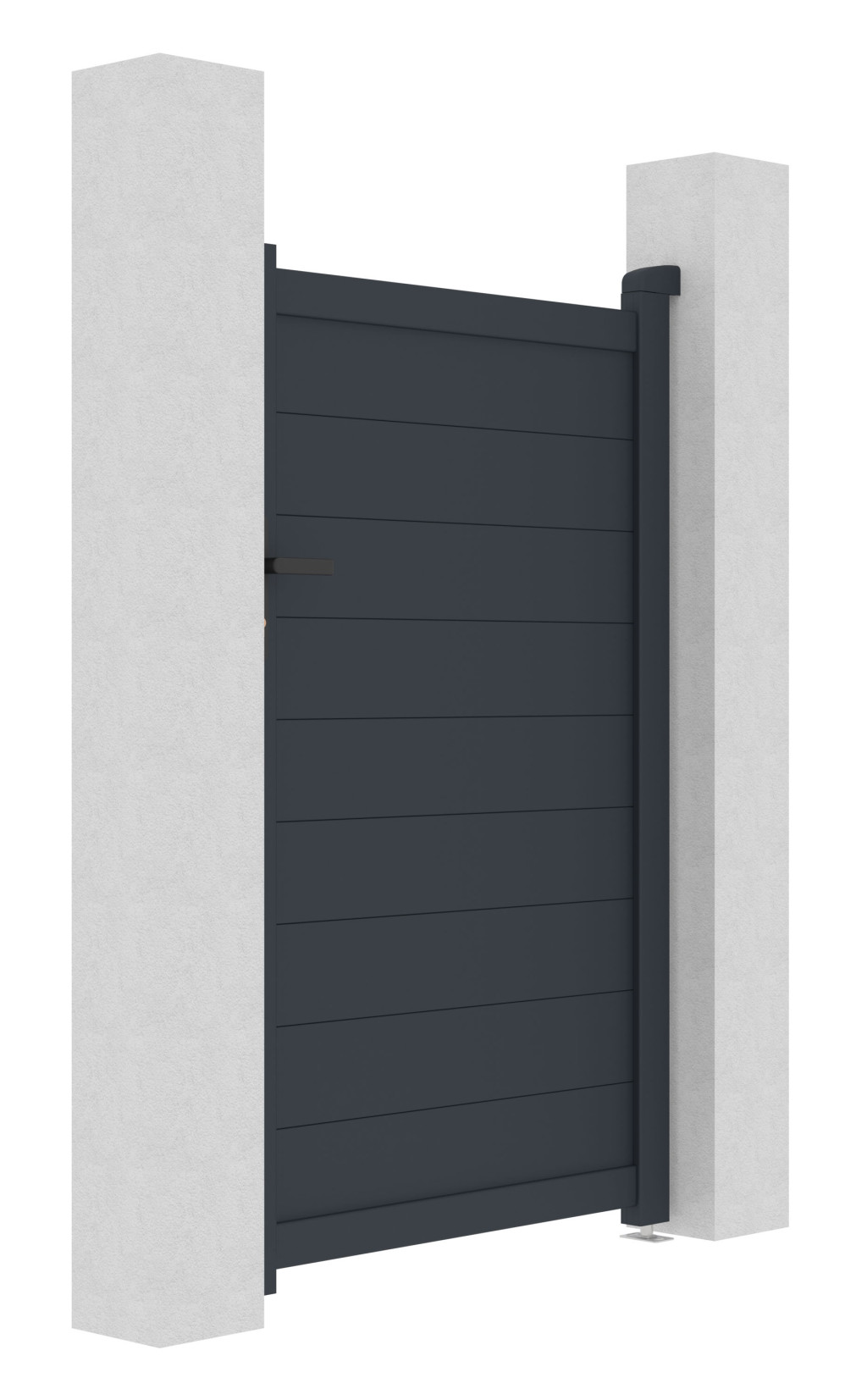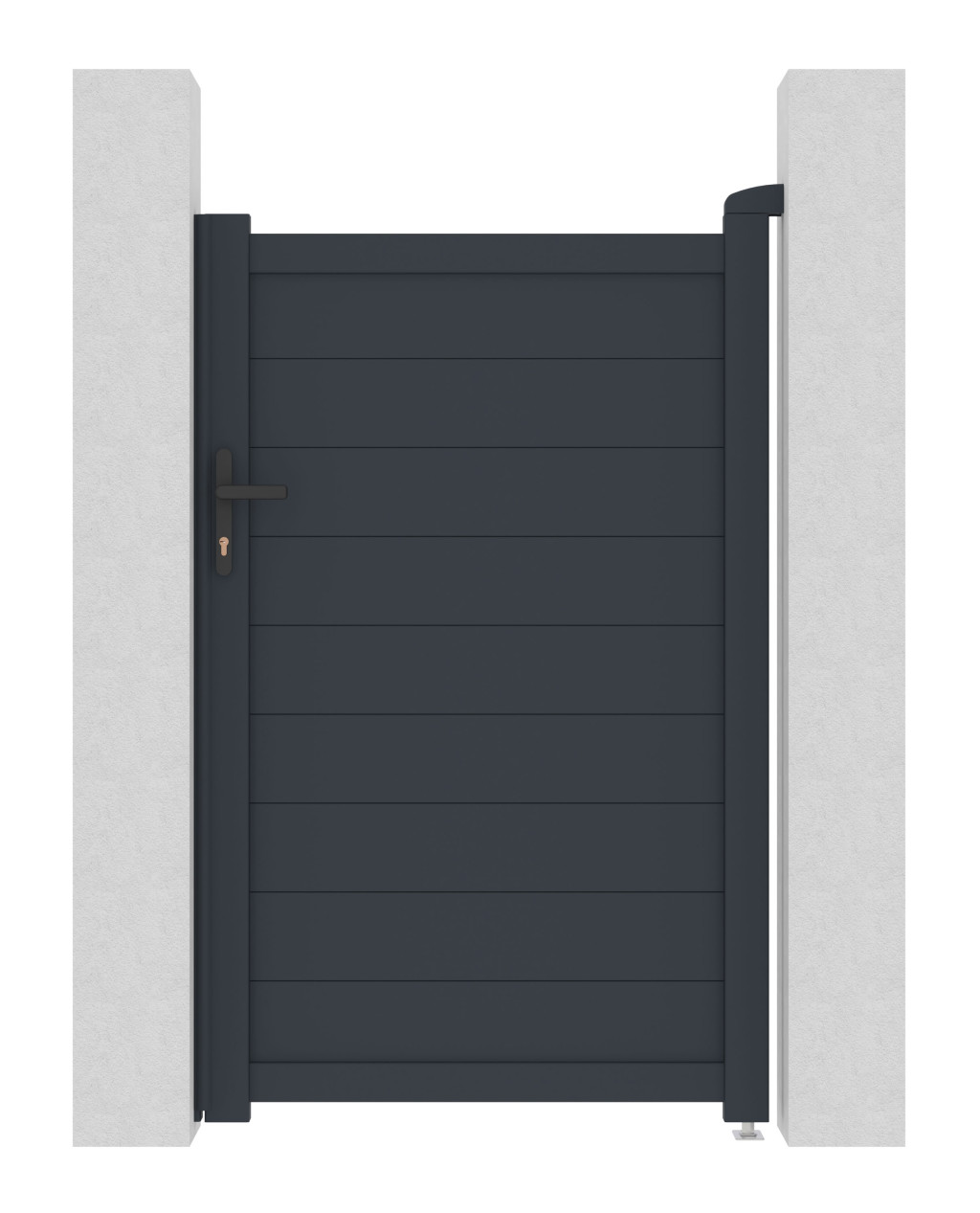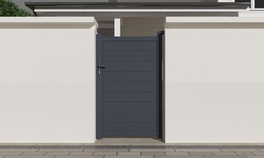 A vízszintesen elhelyezett lamellák grafitszürke kivitelben diszkréciót és modern megjelenést kínálnak, így a belső nyílású kapu bármilyen kerítéshez illik.