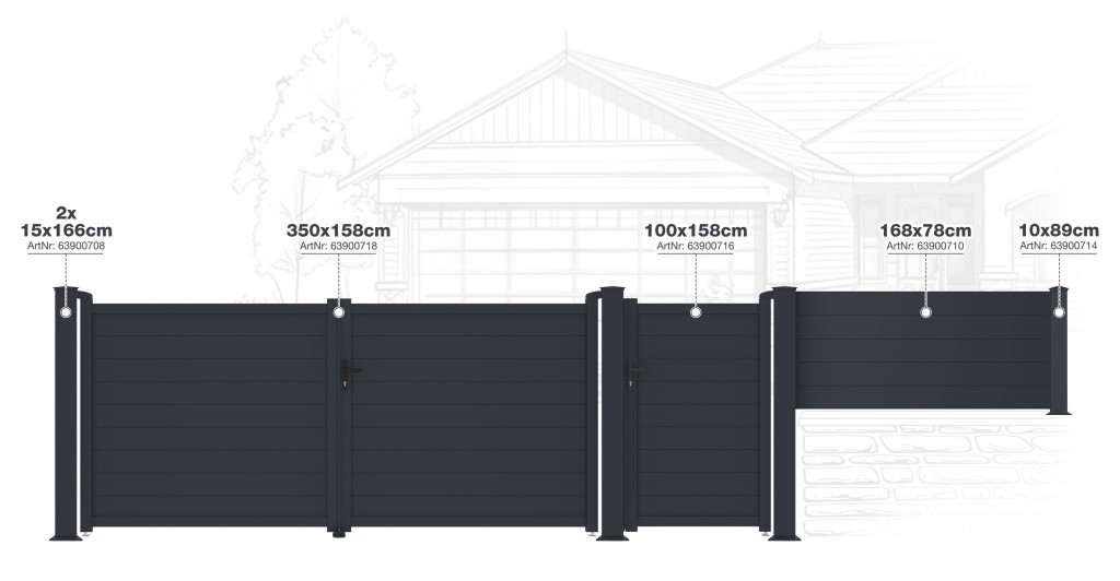 Ha a kapu túl széles a meglévő kerítéspillérekhez vagy a járdához, könnyen lerövidíthető. Vágja le a felső és alsó lamellás sínt egyenes vágással (pl. dekopírfűrésszel vagy kézi körfűrésszel) a kívánt hosszúságra, majd kövesse az összeszerelési útmutatót.