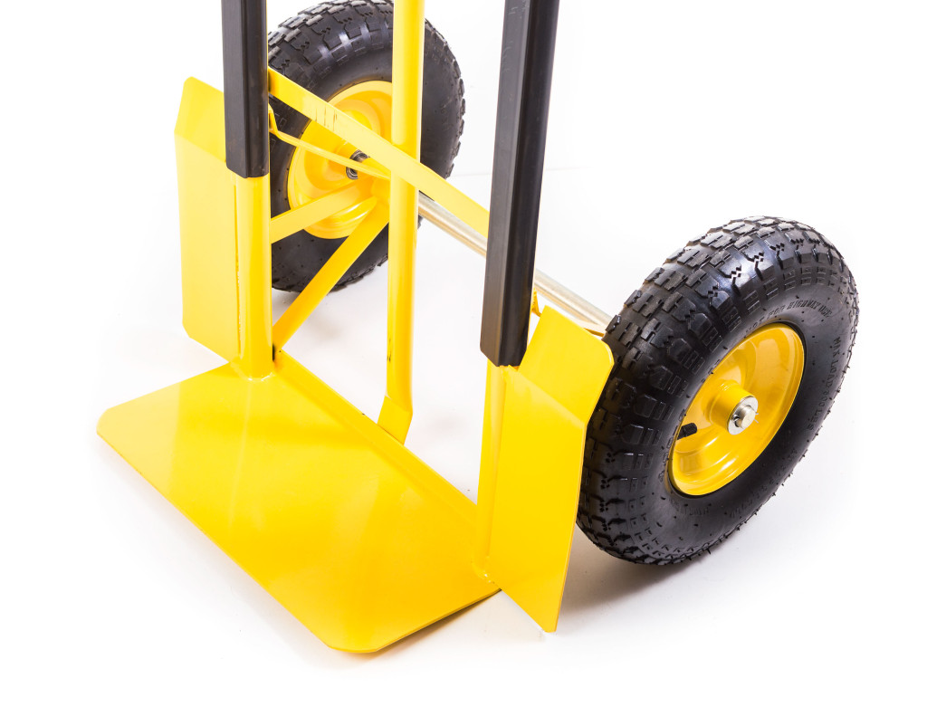 Molnárkocsi profi és hobbi szintű használatra 300 kg teherbírással, felfújható bantam kerekek 33 cm átmérővel, masszív vas szerkezet, átgondolt megoldás a felület, kerekek és a váz védelmére. A lapát mérete 41 x 21,5 cm. Védőfesték, sárga szín.