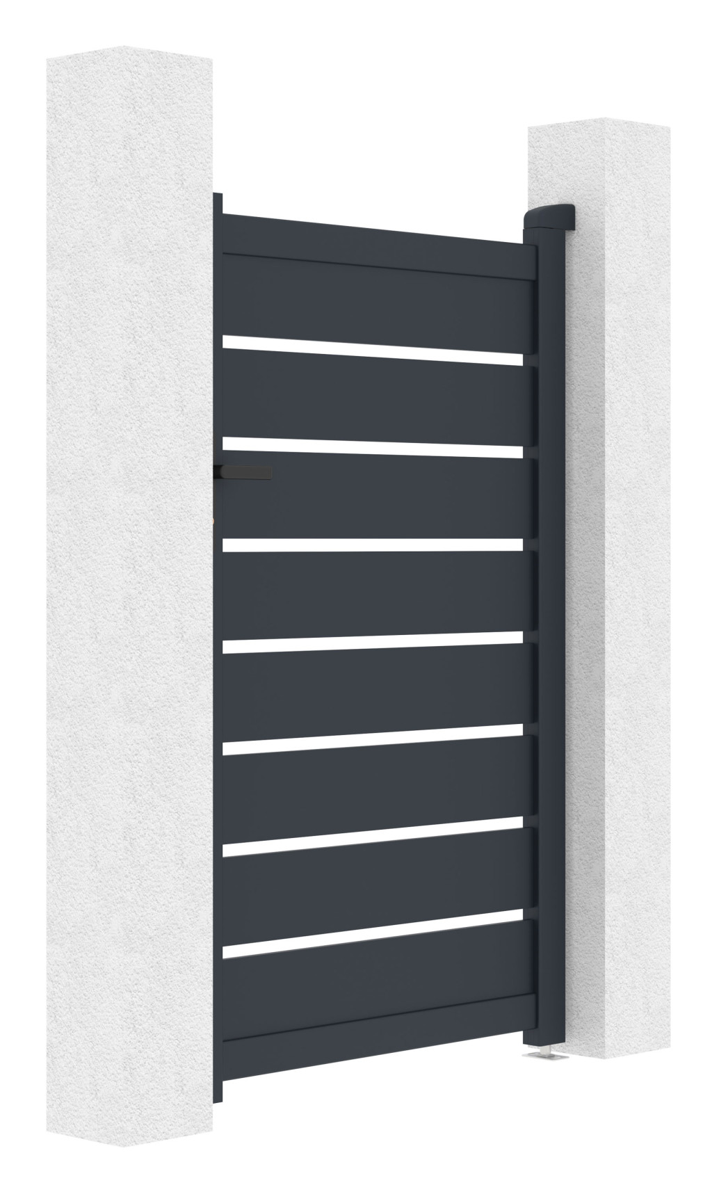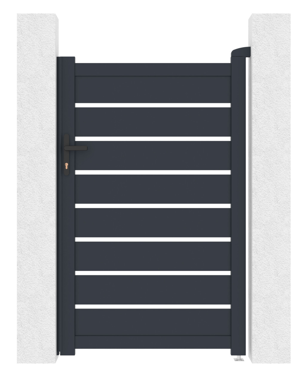 A vízszintesen elhelyezett, tetszetős grafitlécekkel ellátott betét a kellő magánéletet a modern dizájnnal ötvözi, így a befelé nyíló kapu bármilyen típusú bekerített szerkezethez illeszkedik.