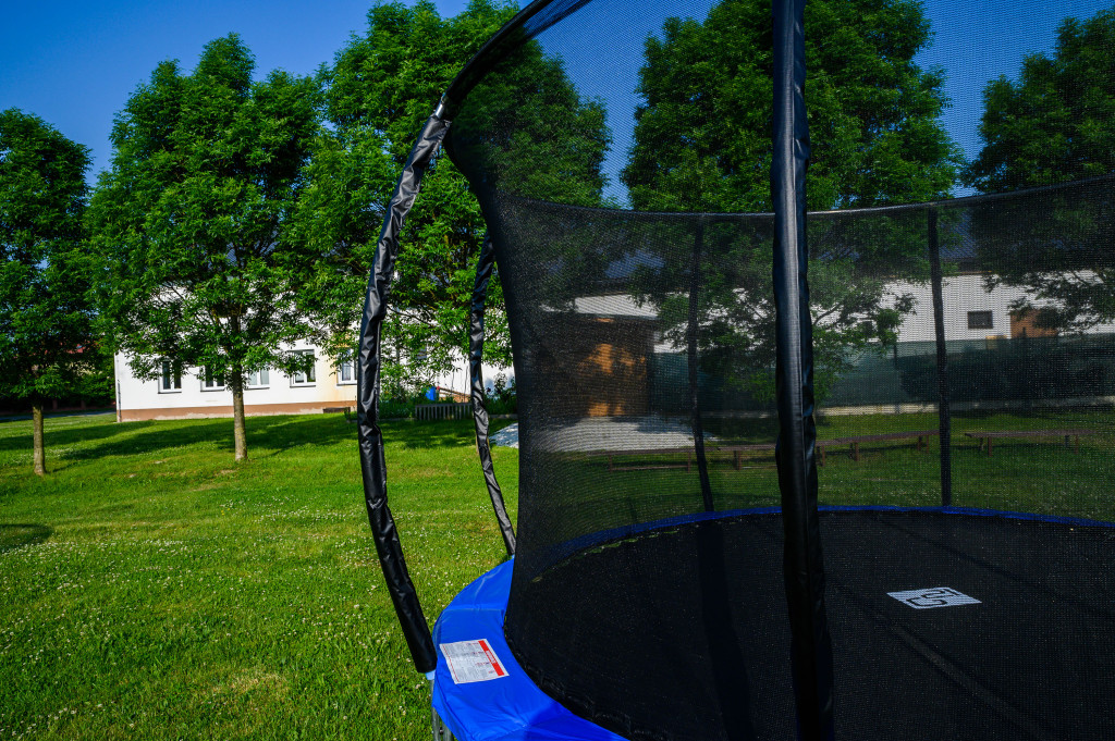 Nagy figyelmet fordítottunk a trambulin rugók megbízható burkolására is, hogy minimalizáljuk a sérülések kockázatát. A rugófedél tartós, vízálló anyagból készült, puha töltéssel. A trambulin oldalsó oszlopait vízálló, lágy habborítással vontuk be.