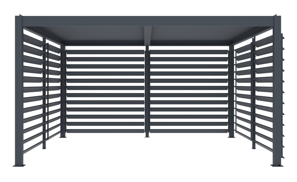 Oldalfal forgatható, horganyzott lamellákkal a fokozott védelemért szél, eső és napfény ellen. Stabil alumínium szerkezet, egyszerű telepítés.