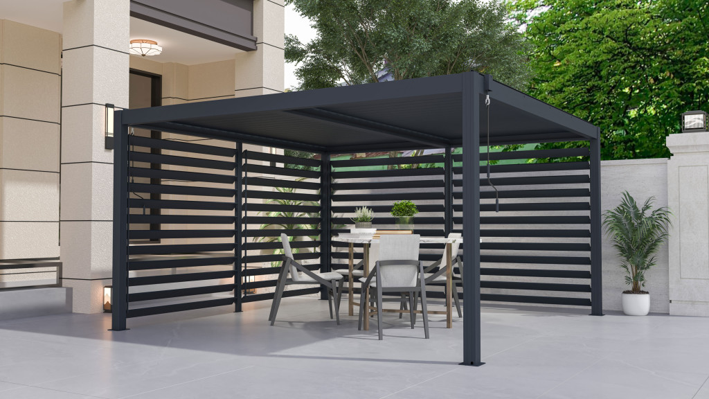Ezzel a forgatható lamellás oldalfallal teljes mértékben irányíthatja kültéri környezetét, biztosítva a kényelmet és a magánszférát egész évben.