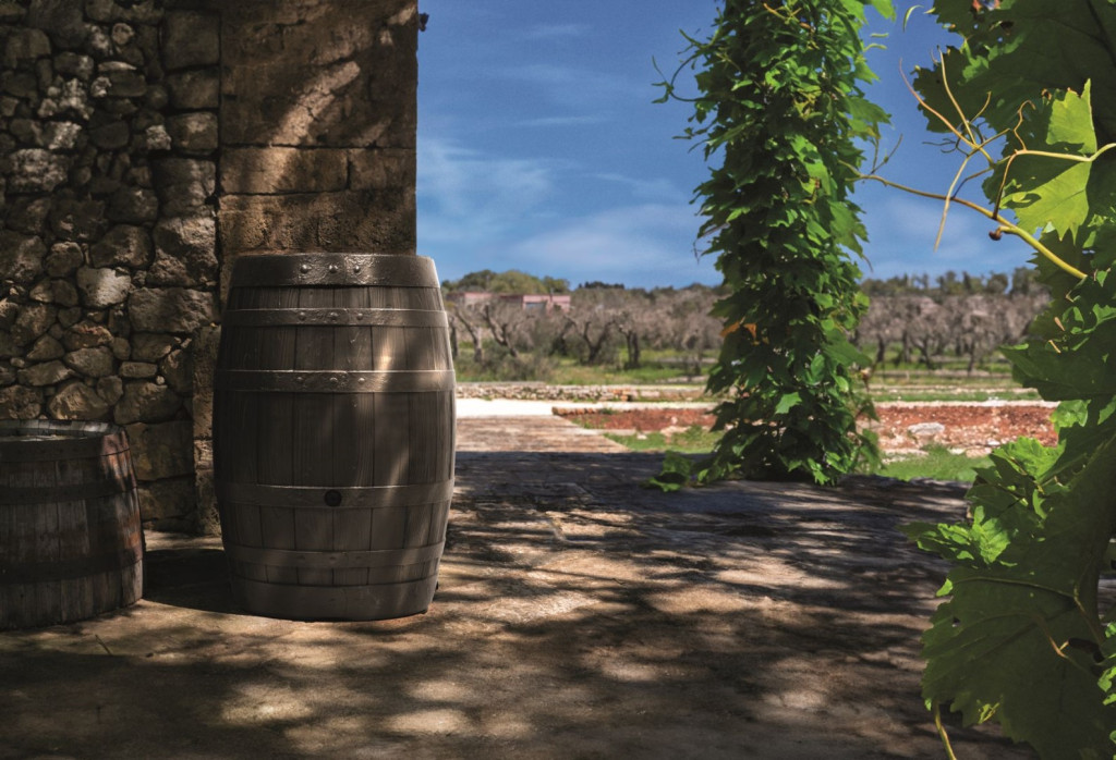 Esővízhordó, 250 l térfogatú, fagyálló, csap és téli lefolyófedő mellékelve. PE anyagból, bajor söröshordó szerelvényekkel, hagyományos kivitelben, 65,2 x 93 x 65,2 cm.