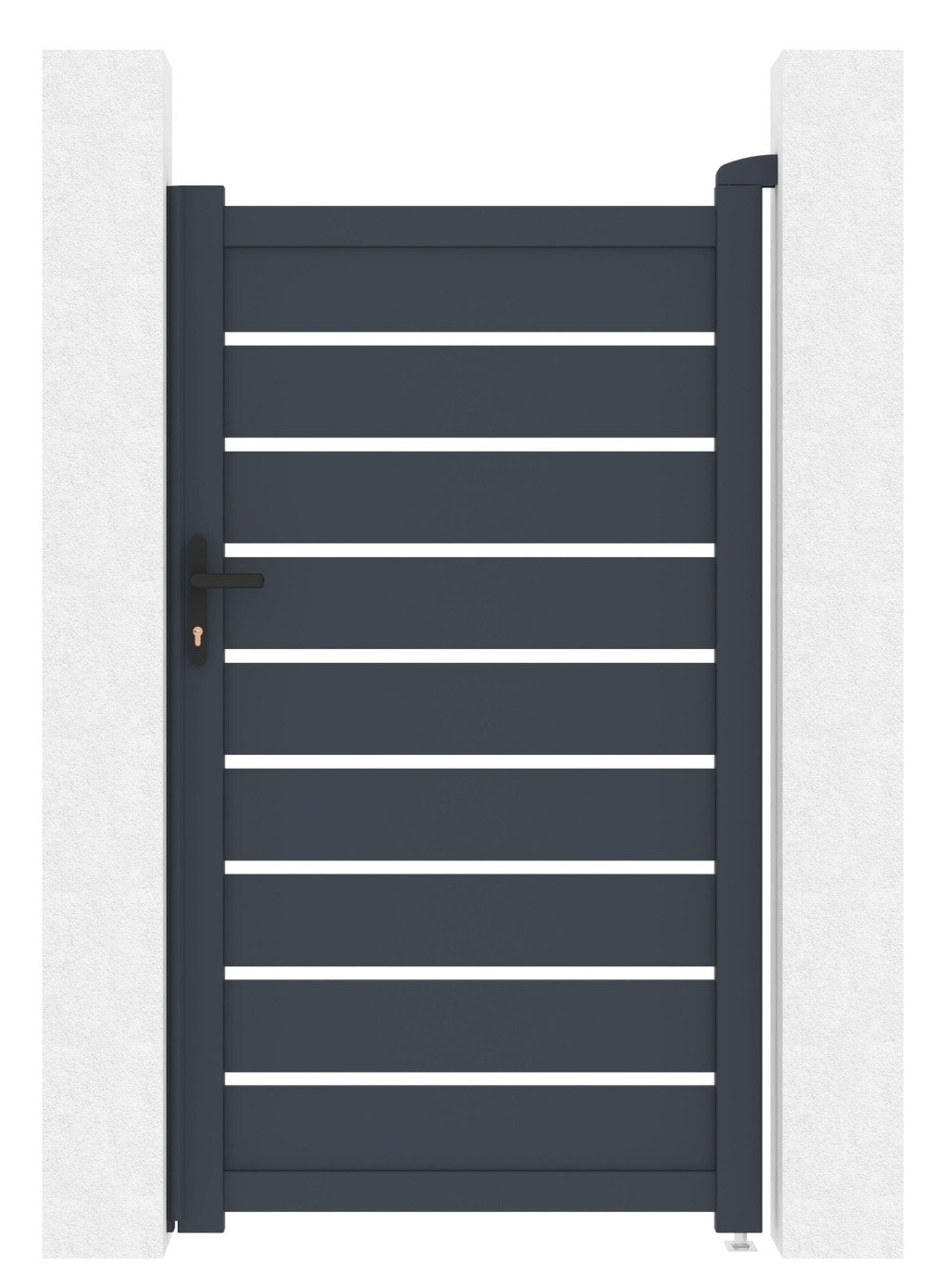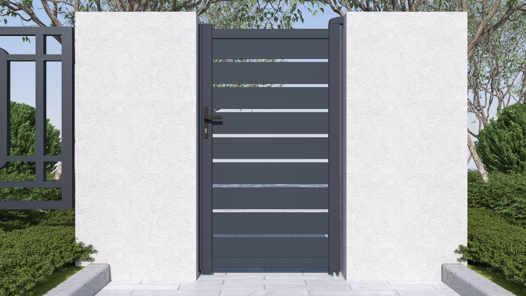 A kerítéskapu kulcsfontosságú eleme egy ingatlan vagy telek kerítésének. A porbevonatnak köszönhetően a 176 cm magas Reno alumínium kapu még hosszabb élettartamú, tartós és egyben lenyűgöző és a szélessége a meglévő kerítéshez igazítható. . Fogantyúnyitás és zár FAB betéttel.