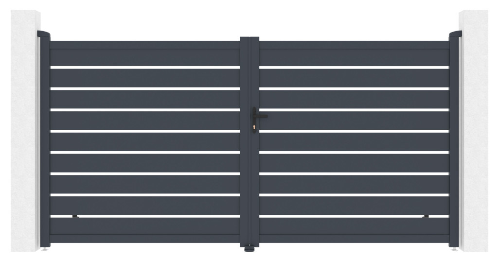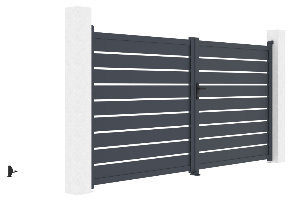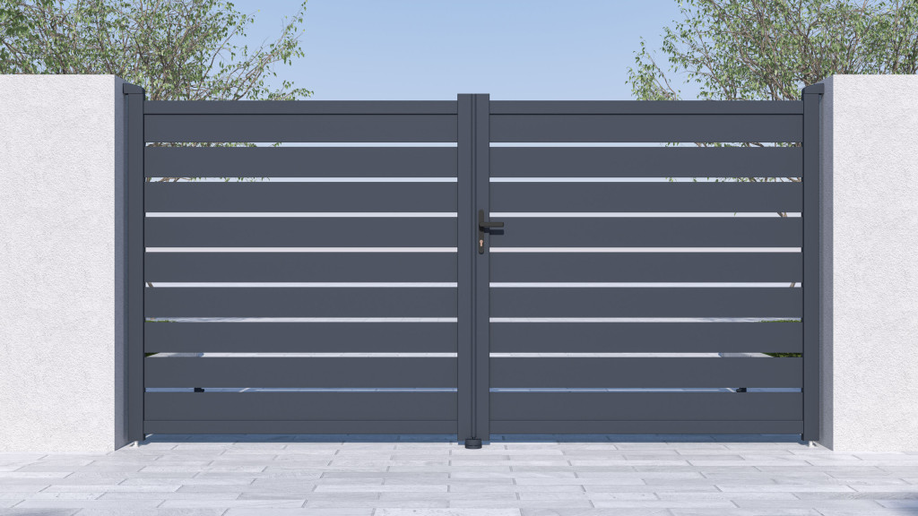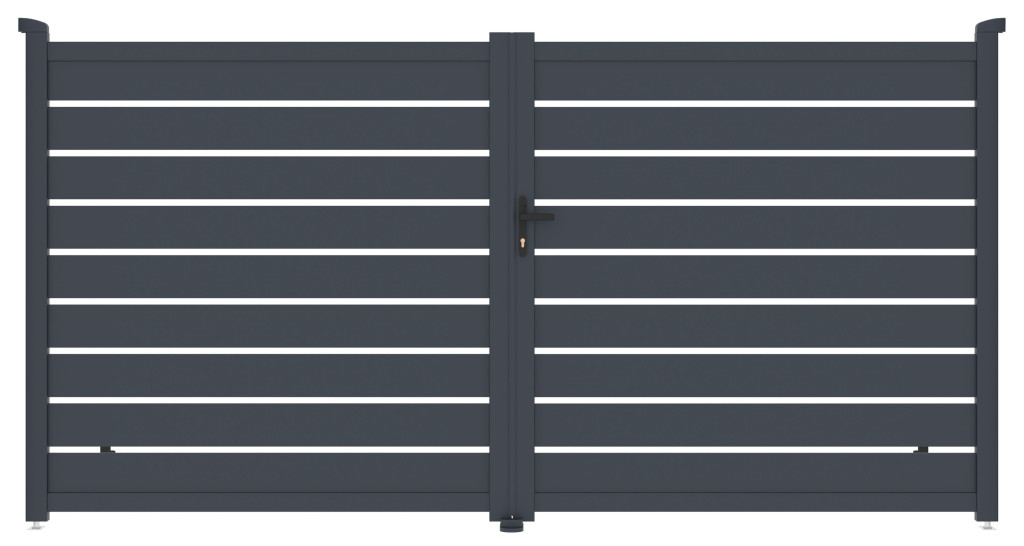 A vízszintesen elhelyezett lécekkel ellátott, tetszetős grafit kialakítású kitöltés a kellő magánéletet ötvözi a modern dizájnnal, így a kapu bármilyen típusú bekerített szerkezethez illeszkedik.