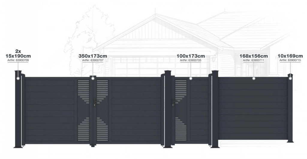 A 168 cm széles kerítés 156 cm magas, anyaga alumínium, korrózióvédő porszórással. Egyszerű, vonzó kialakítás, karbantartásmentes, méretre szabható szélesség.
