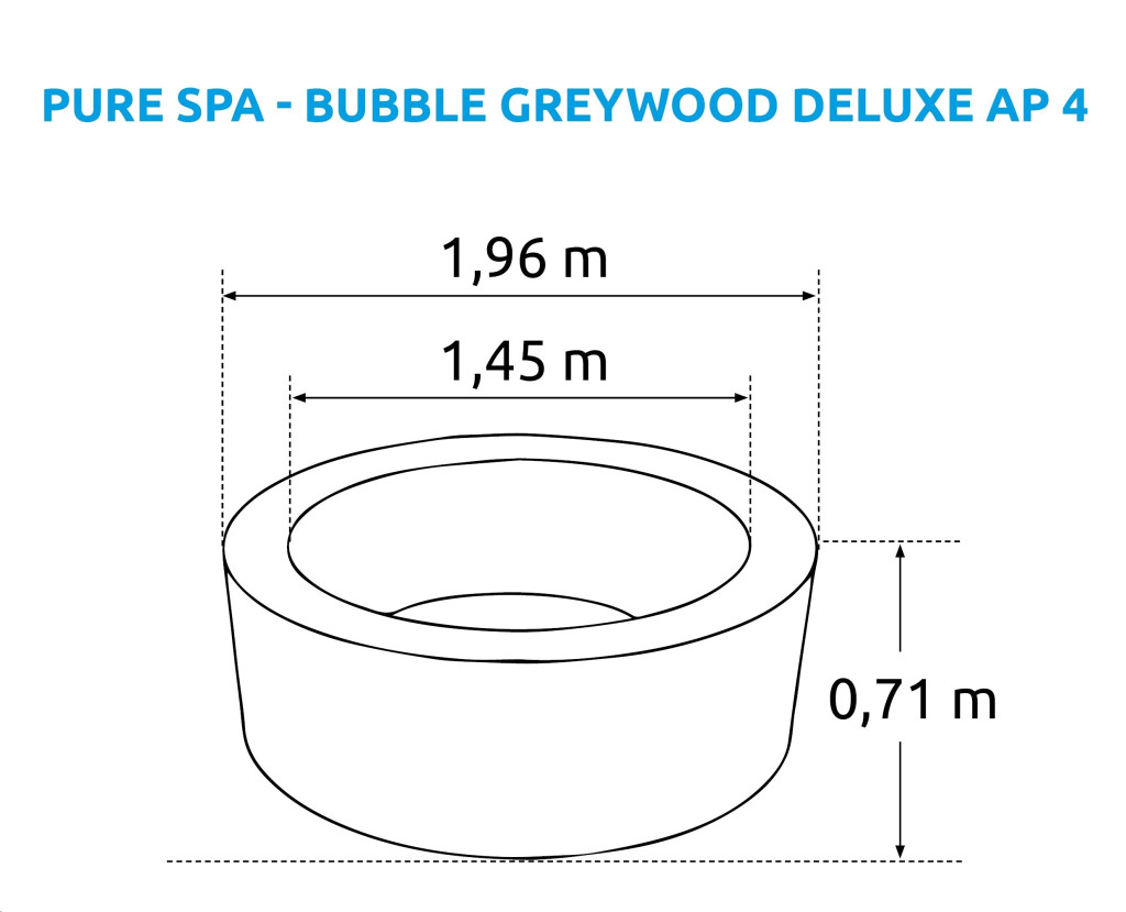 A 145 cm belső átmérőjű Pure Spa - Bubble Greywood Deluxe AP 4 pezsgőfürdő új WIFI funkciójával nyűgöz le, amellyel a pezsgőfürdőt mobiltelefonjával párosíthatja és vezérelheti. További előnye, hogy a HWT vízlágyító rendszer tökéletes kikapcsolódást biztosít akár 4 személy számára.