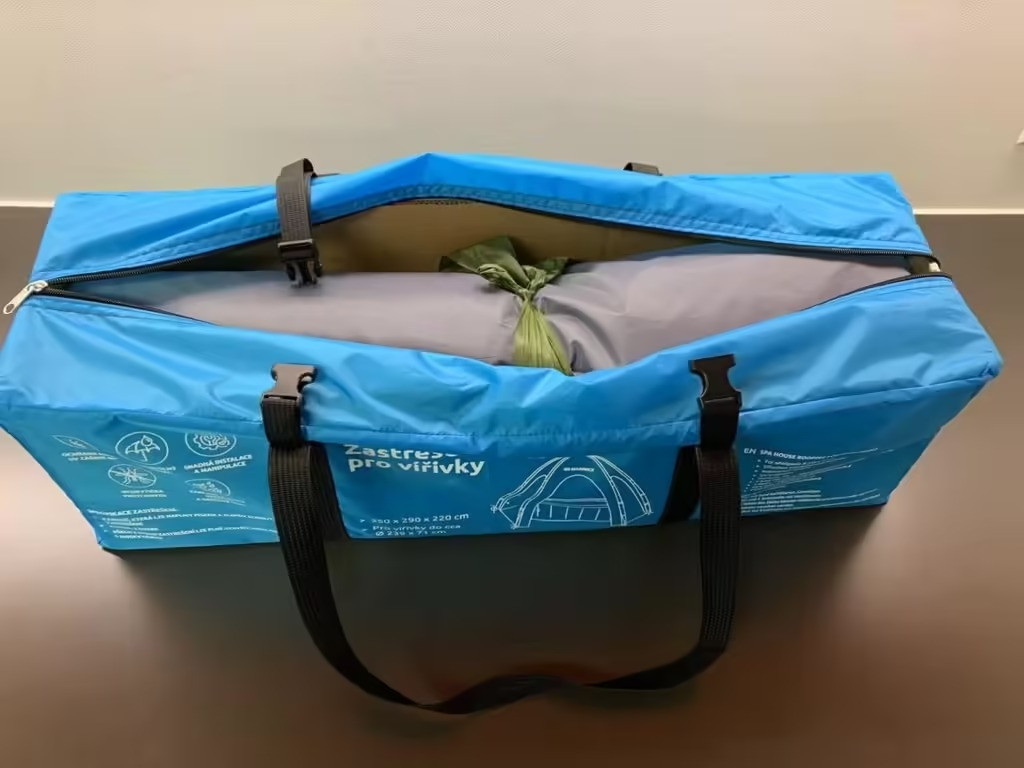 A tető vízálló anyagból készült. Nem engedi át az esővizet vagy a szennyeződést. Könnyedén felszerelhető a pezsgőfürdőre. Csak bővítse ki a keretet, és feszítse rá . A csomag tartalmaz súlyokat is, amelyeket homokkal tölthet meg. Biztosítja a tető jobb stabilitását.