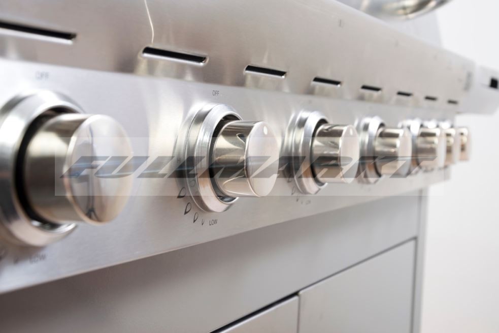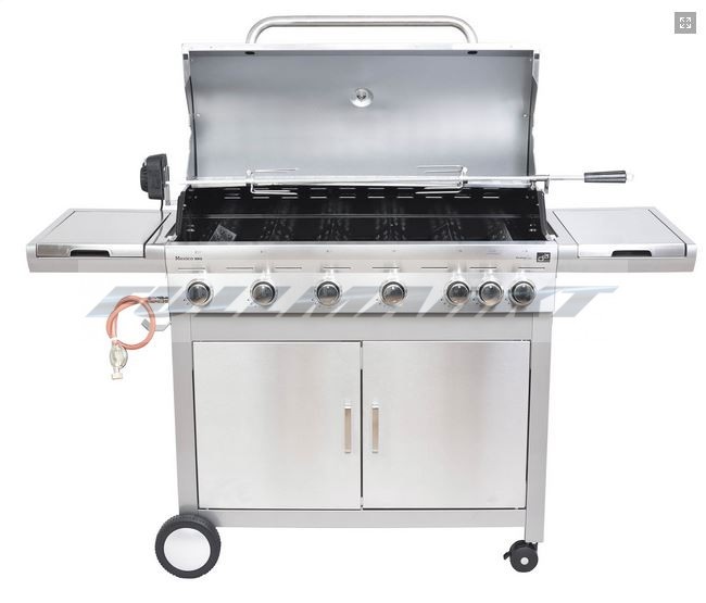 A G21 Mexico BBQ Premium Line gázgrill Flame Tamer rendszerrel, 6 rozsdamentes acél főégővel, egy oldalsó égővel, elektromos gyújtással és gázszabályzóval rendelkezik.