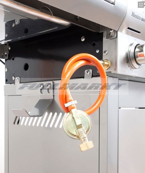 A kerti rozsdamentes acél gázgrill egy csuklós fedéllel rendelkezik, mely lefedi a grillező felületet, továbbá az oldalán polcokkal van ellátva. A bal polc alatt egy tárolóedény van, amibe beleteheti pl. az előre bepácolt húst. A jobb polc alatt van az oldalsó égő. Öntöttvas lemezzel és öntöttvas ráccsal van ellátva. Az ajtók rozsdamentes acélból készültek.