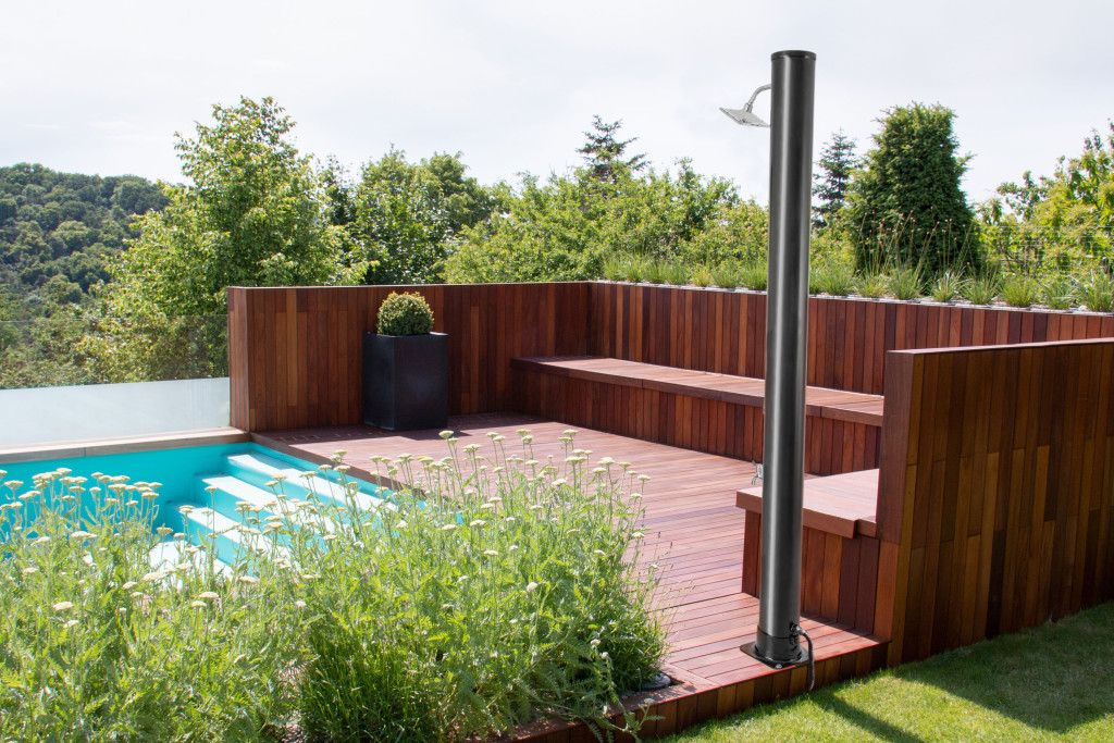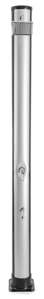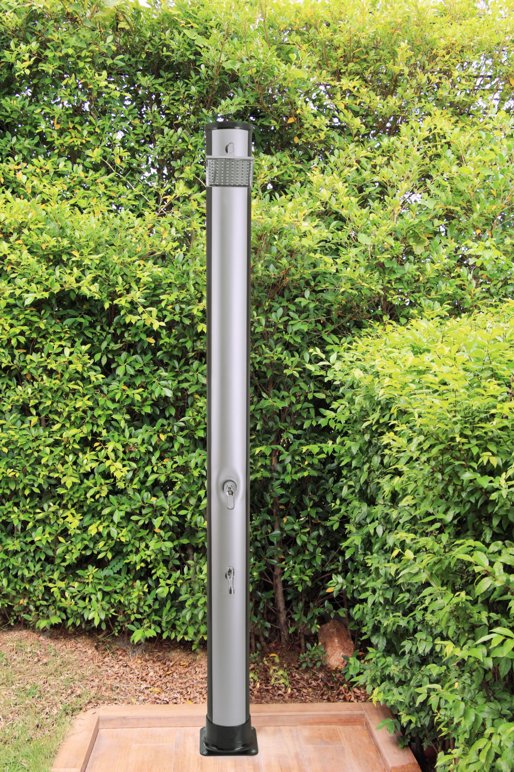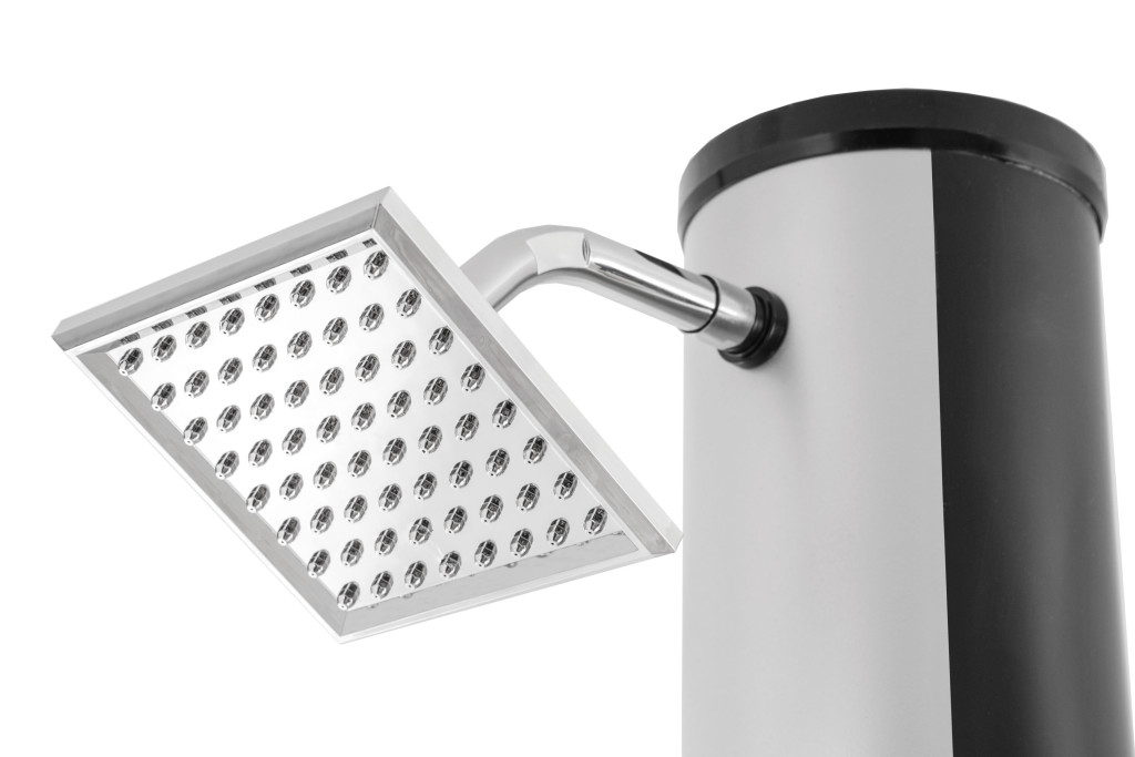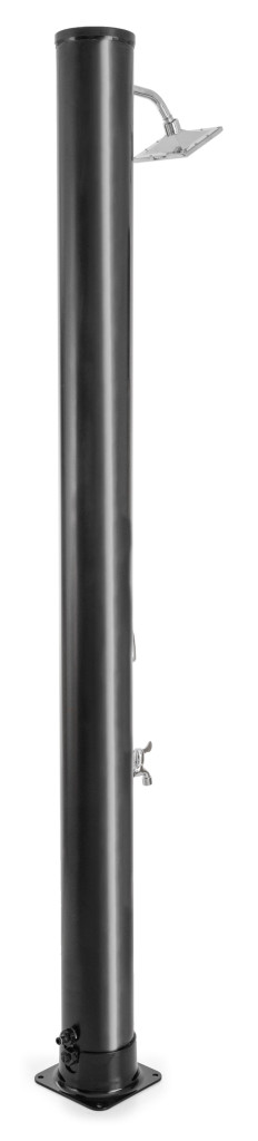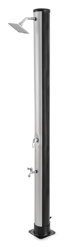 A fekete-ezüst színű zuhanytest napkollektorként funkcionál, elnyeli a napenergiát és felmelegíti a vizet áram vagy gáz nélkül. Zuhanyozás medencézés előtt csökkenti a víz szennyeződését, és ezzel megkönnyíti a karbantartást.