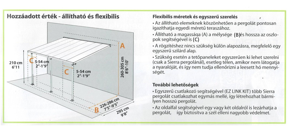 - Egyszerű csatlakozó segítségével (EZ LINK KIT) több Sierra pergolát csatlakozhat egymás mellé, így létrehozhat bármilyen hosszú pergolát.