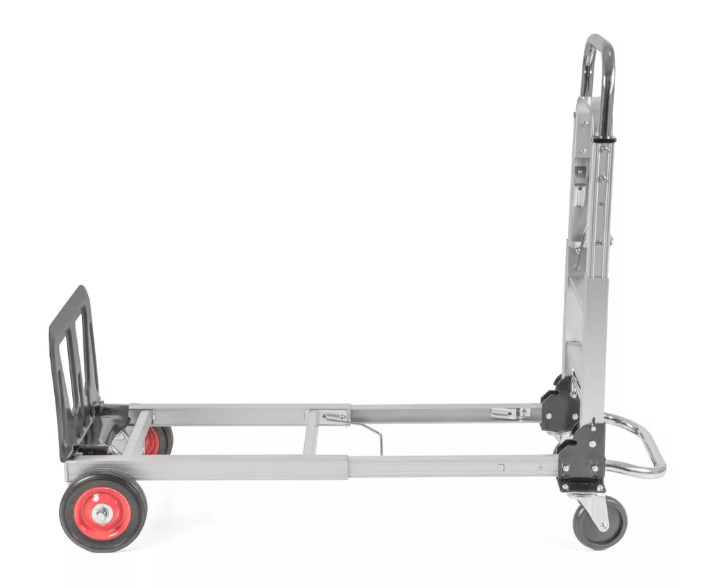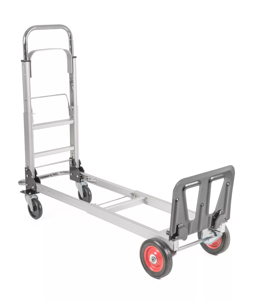 Multifunkcionális 2 az 1-ben gurulós kocsi - gurulós és szállító kocsi, nehéz terhek kezeléséhez, alumínium konstrukció, teherbírás 150 kg, 15 cm átmérőjű kerekek.