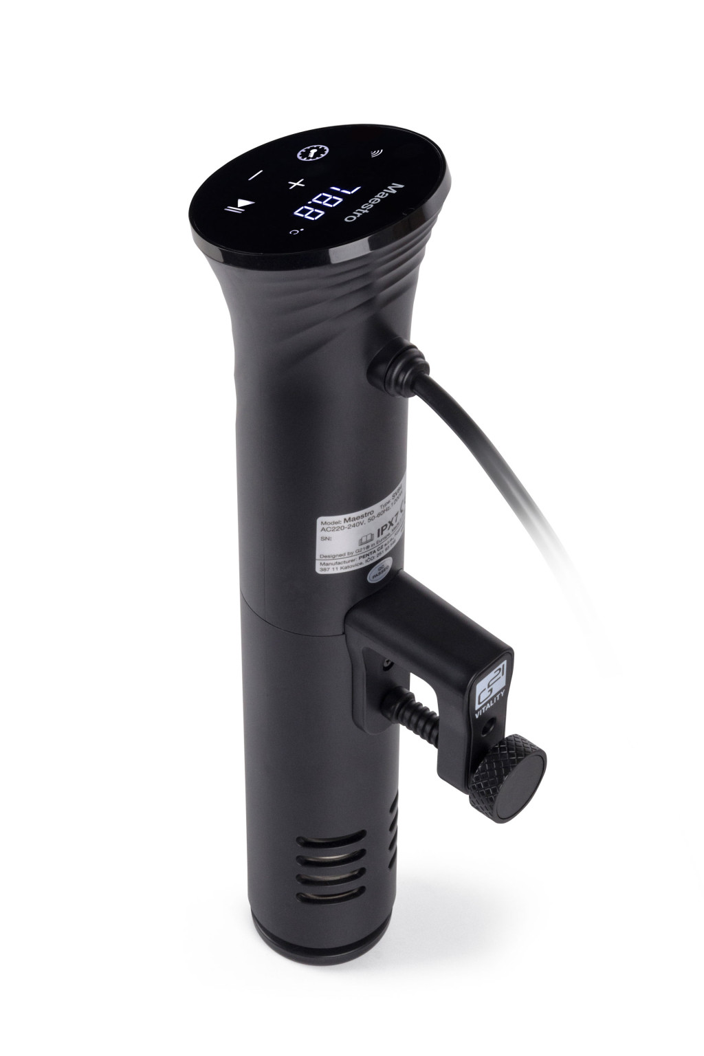 A G21 Maestro sous-vide főző a szuvidolás igazi mestere. Figyeltünk a legapróbb részletekre és természetesen a biztonságra is. Elegáns kivitelezésű, két fő komponensből áll: egy merülő részből, amelyben a főzőspirál található valamint egy felső részből, amelyben az érintőképernyő és az elektronika található. A G21 Maestro sous-vide főző kiegészítőivel biztonságosan rögzítheti a főzőedény széléhez.