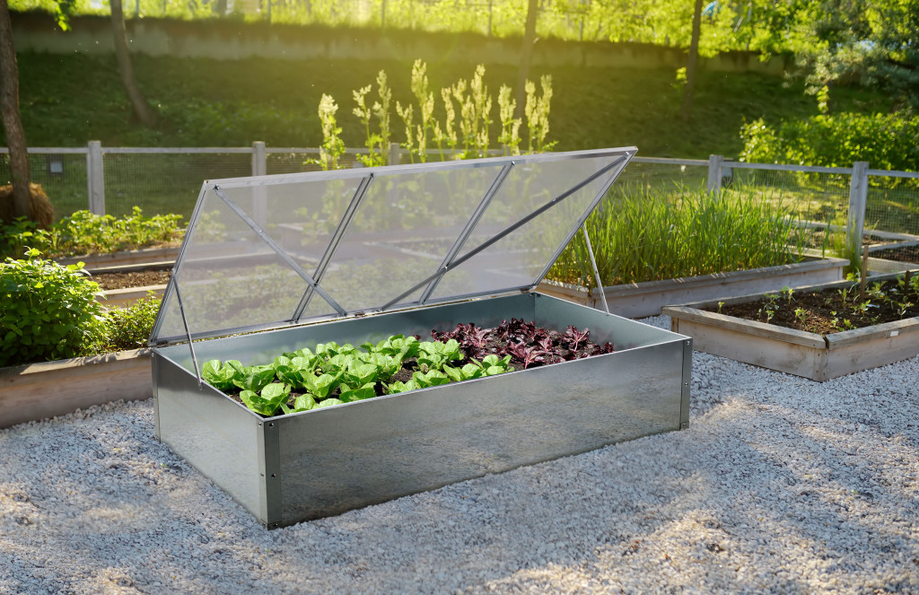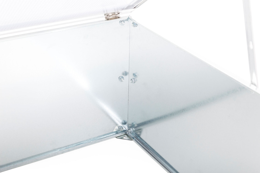 A felső alumíniumkeret  4 mm-es polikarbonát töltelékkel kényelmes hozzáférést biztosít az ültetéshez és a már elültetett növények gondozásához.